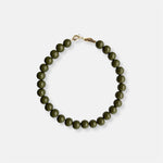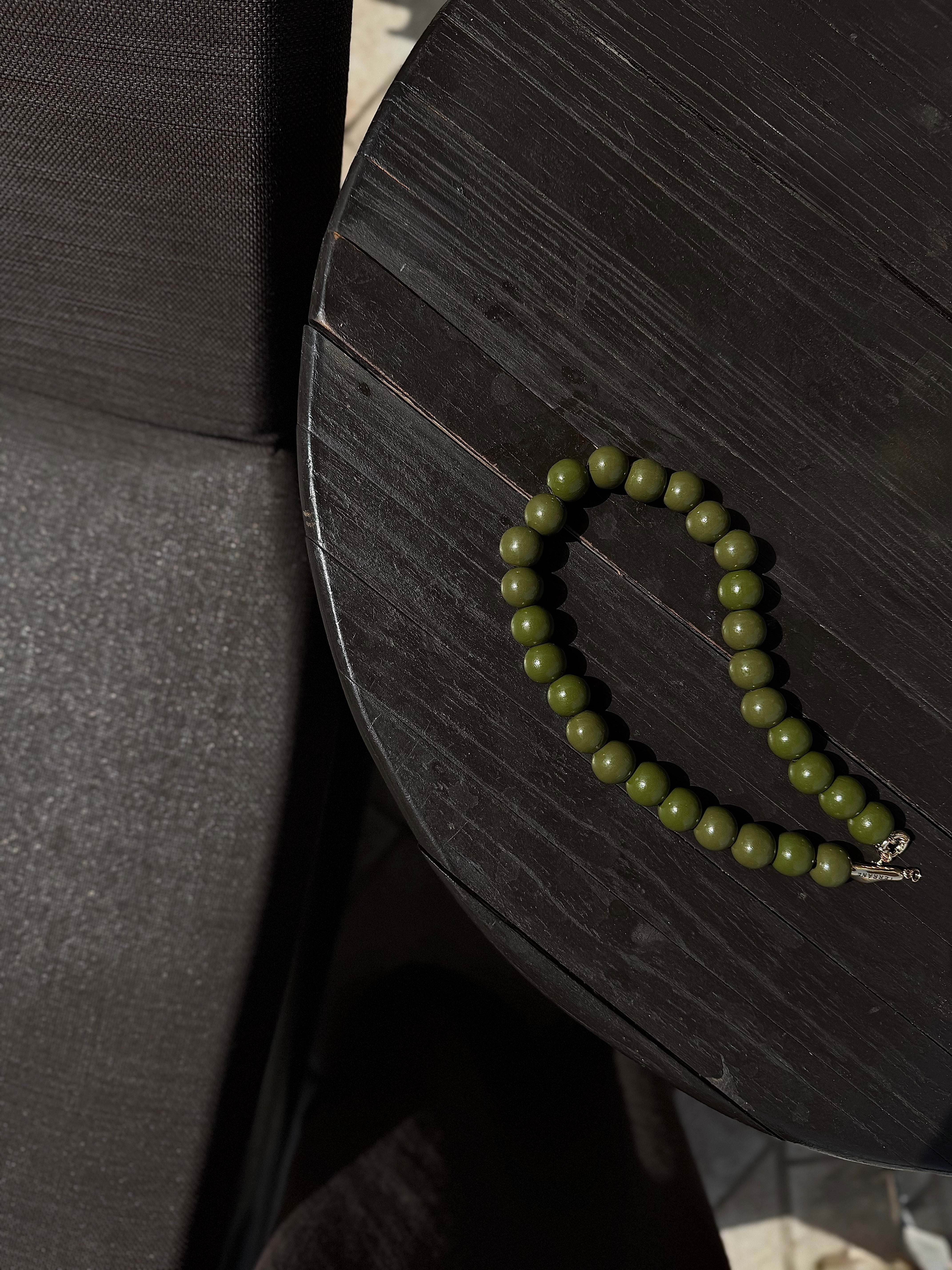Este collar hecho con cuentas de madera natural, ligeras, orgánicas, imperfectamente bellas, con una joya grabada en su extremo.
