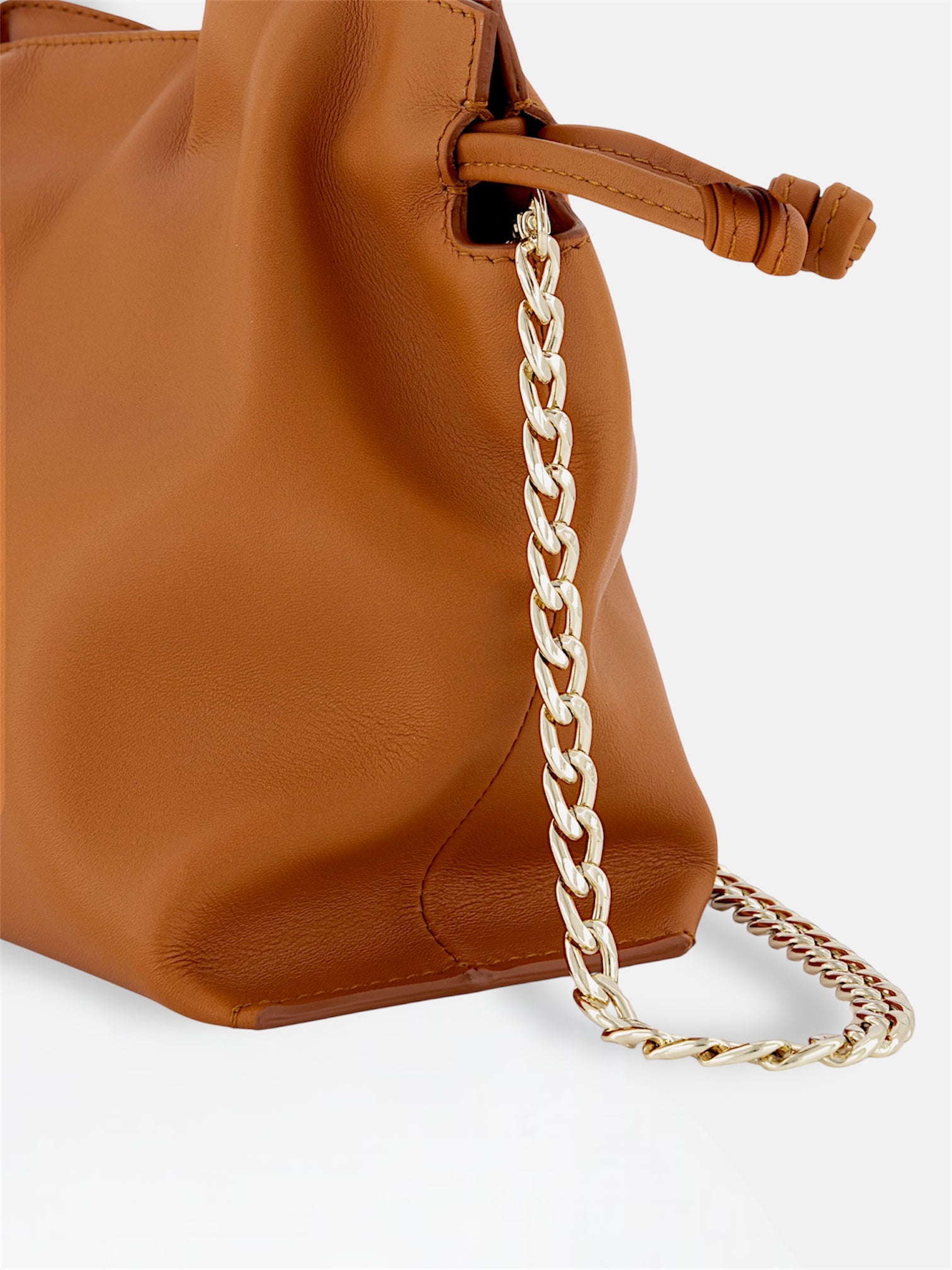 Incluida cadena bandolera con refuerzo de piel, ideal para llevar al hombro o cruzado, con refuerzo de piel artesanal del mismo color que el bolso para mayor comodidad.