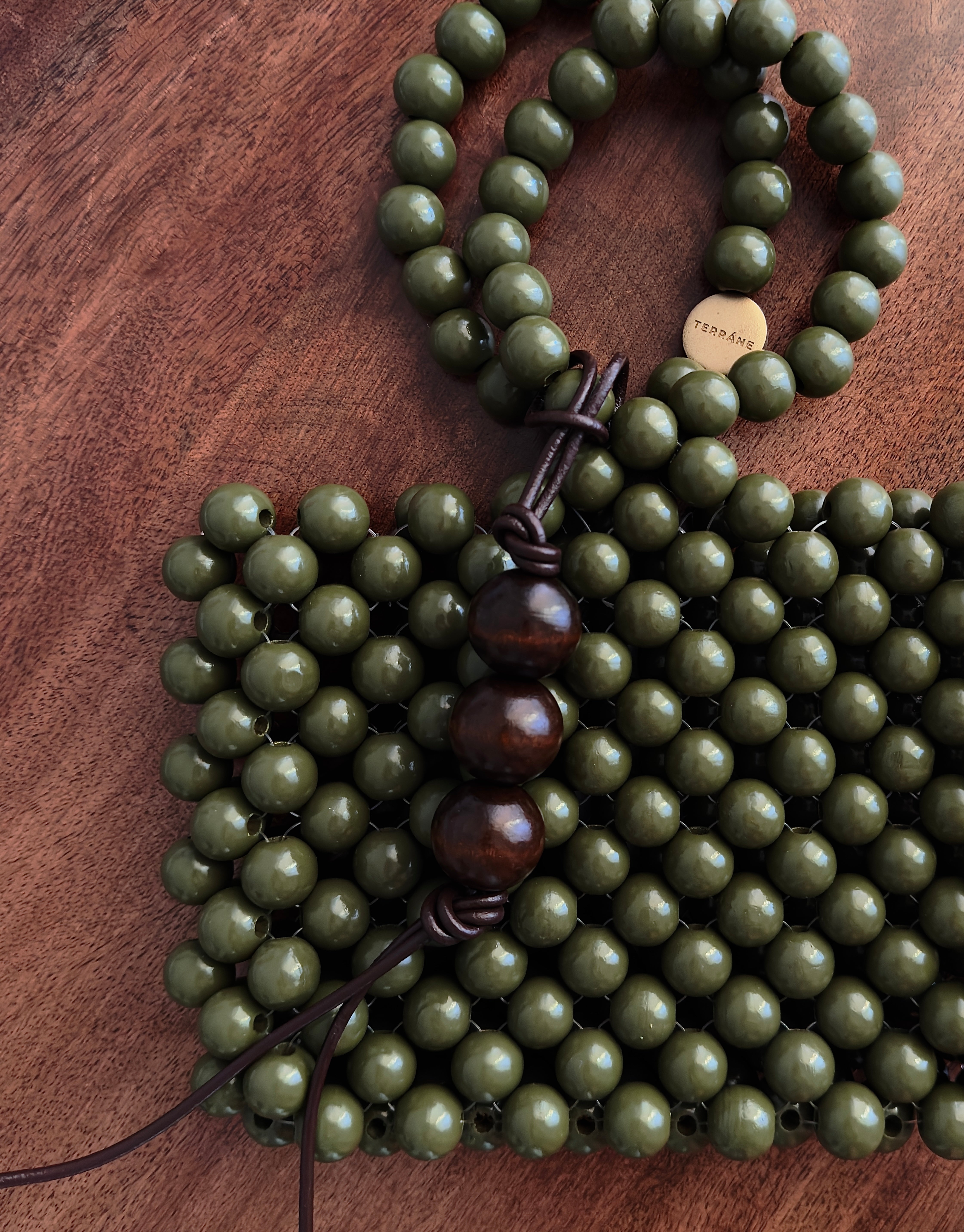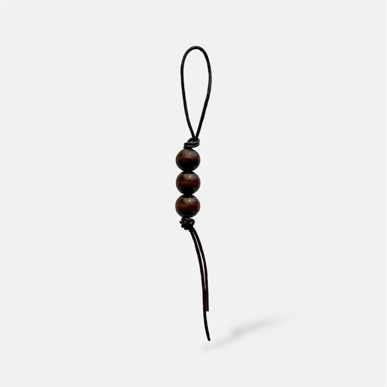 Charm hecho con piel vacuna y cuentas de madera natural teñida en castaño. Perfecto para tu bolso favorito o como llavero.
